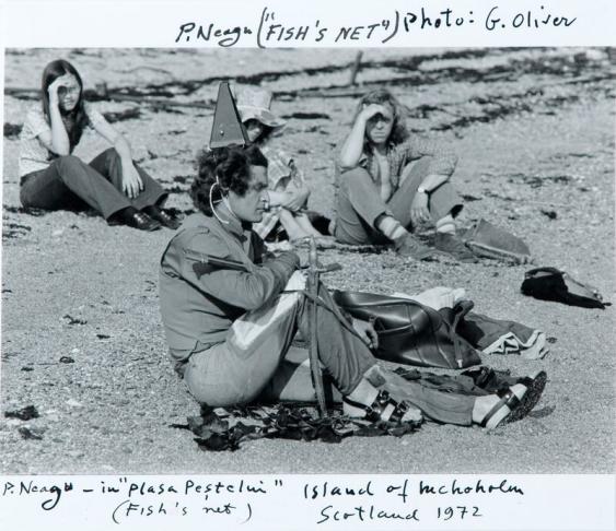 During the Edinburgh Festival of 1972 (3–28 July), Paul Neagu performed "Fish’s Net" on Inchcolm Island in the Firth of Forth. His distinctive performative vocabulary was nurtured by an interest in an open form of investigation based on associations and correspondences between natural gestures, simplified forms or symbols, and the elaboration of a subjective cosmology that aimed to create a dialogical relationship with the viewers. In a preparatory drawing for that performance, Neagu presented the diagram of a human figure with a metronome on its head and indications for actions and props (knives, transparent plastic tubing, bracelet, live fish). The metronome, which was to reappear in his later performances, functioned as a metaphor that expressed the rhythm of inner energies, while the fish alluded to his conceptual and profoundly metaphysical approach to reality. He was preoccupied with “the spiritual life of symbols,” and “their unmanifested symbolic energy.” The Fish later became one of the Nine Catalytic Stations (1987). A.Se.