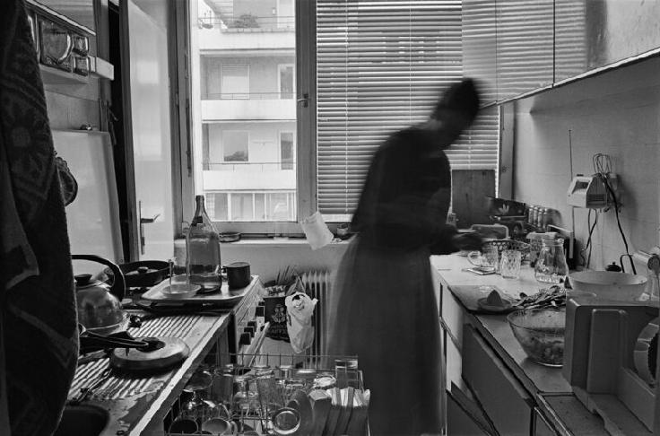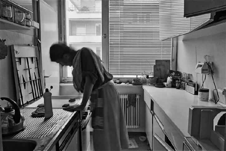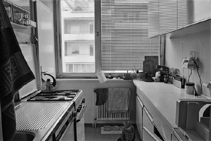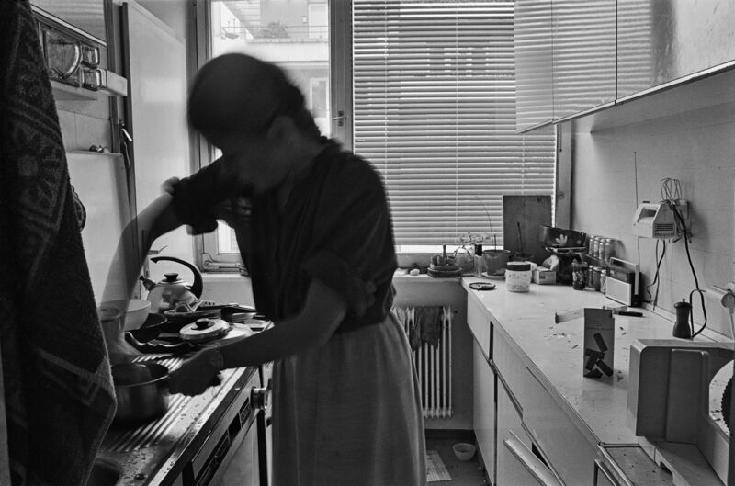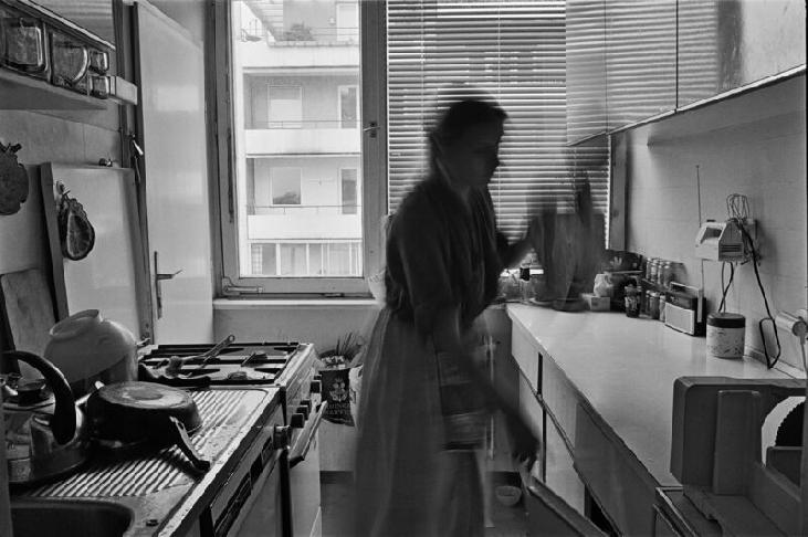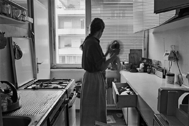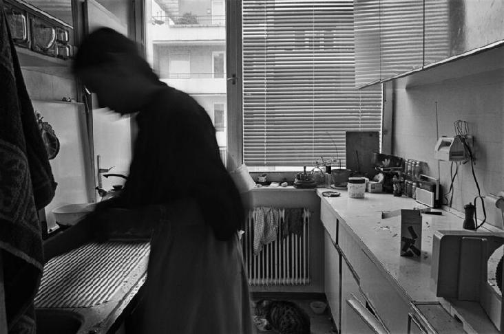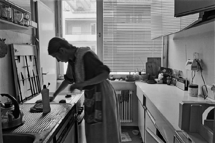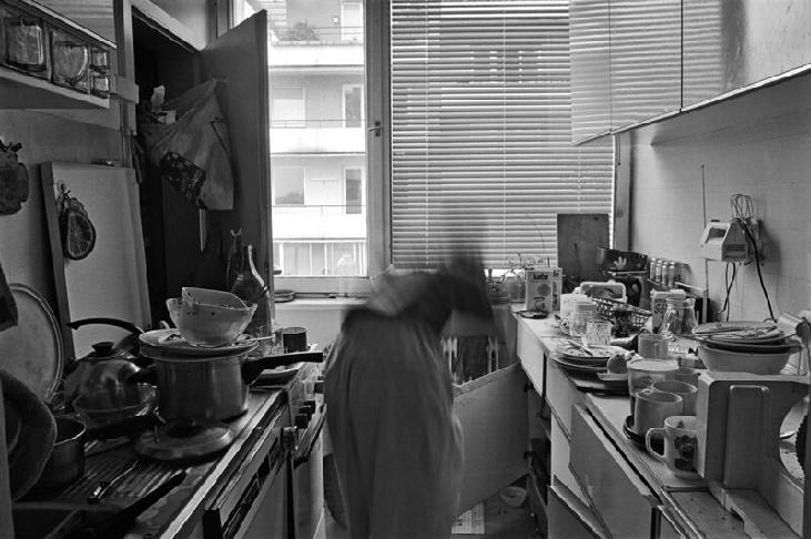 This series of 26 black and white slides named for the day and timespan during which it was taken shows a succession of movements and action performed in the context of conceptual art practices, enacted through and with the photographic medium. The camera assumes one single perspective, showing the artist’s kitchen with dishes waiting to be washed and put away. A conceptual approach of orderliness and exactitude evolves as the slideshow progresses, studying the action. Over the course of more than an hour, the artist is photographed in her endeavor to clean the kitchen and thereby put it in a state that annihilates any traces of the past. Through a mechanically set exposure time, the movements of the artist are captured while her fleeting gestures evade the camera’s otherwise sharp focus on her environment. Hence, this succession of slides accentuates the qualities of the mechanical apparatus and its analog features while adhering to a proto-filmic scenario. Although a very personal statement within Margherita Spiluttini’s oeuvre, this work still does refer to the artist’s focus on architectural and environmental details amidst which people reside and move about only for a certain period of time. There are also visible references to Margarete Schütte-Lihotzky’s “Frankfurt Kitchen” of the 1920s, in which a rational, unpretentious, and socially oriented mode of living supported progress towards a more egalitarian, gender-balanced world. W.S.