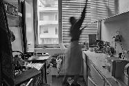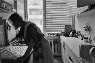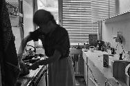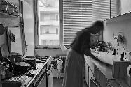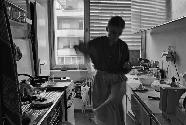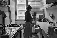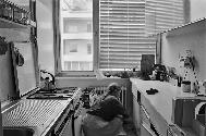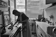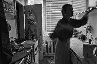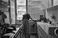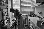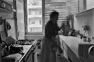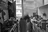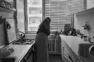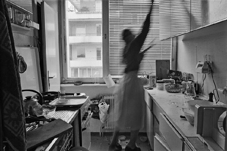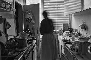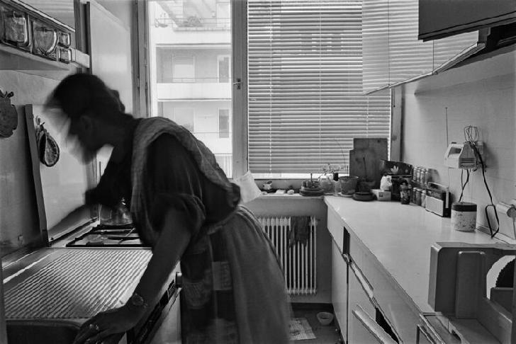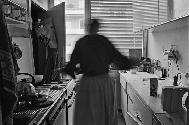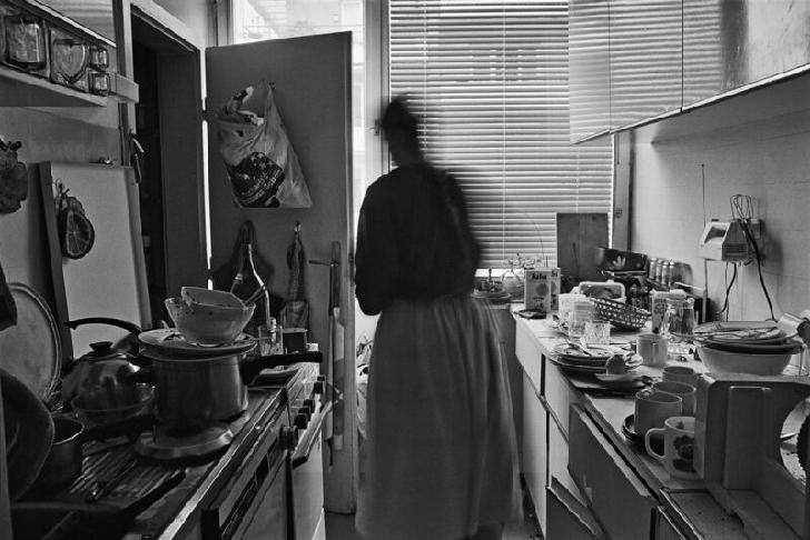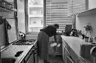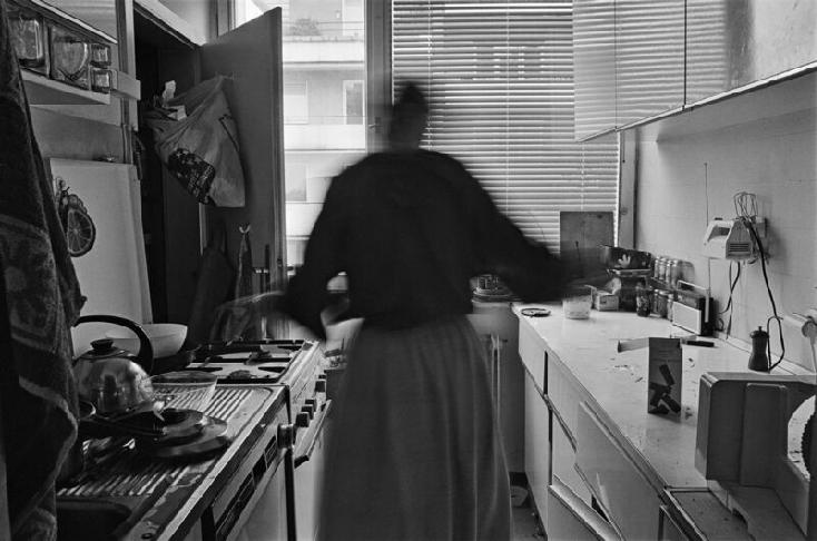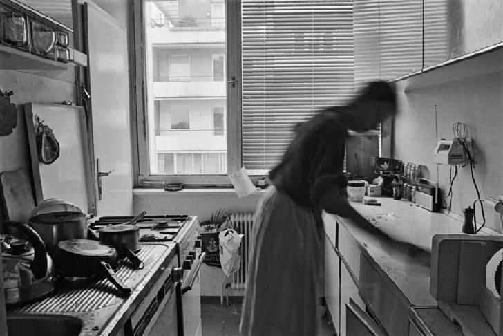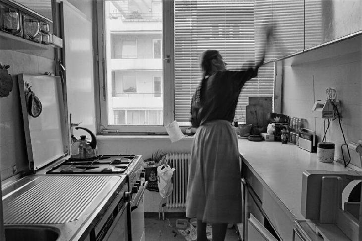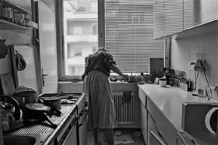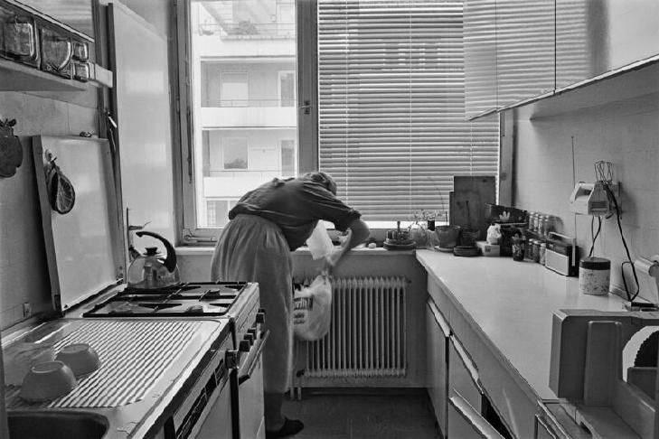 This series of 26 black and white slides named for the day and timespan during which it was taken shows a succession of movements and action performed in the context of conceptual art practices, enacted through and with the photographic medium. The camera assumes one single perspective, showing the artist’s kitchen with dishes waiting to be washed and put away. A conceptual approach of orderliness and exactitude evolves as the slideshow progresses, studying the action. Over the course of more than an hour, the artist is photographed in her endeavor to clean the kitchen and thereby put it in a state that annihilates any traces of the past. Through a mechanically set exposure time, the movements of the artist are captured while her fleeting gestures evade the camera’s otherwise sharp focus on her environment. Hence, this succession of slides accentuates the qualities of the mechanical apparatus and its analog features while adhering to a proto-filmic scenario. Although a very personal statement within Margherita Spiluttini’s oeuvre, this work still does refer to the artist’s focus on architectural and environmental details amidst which people reside and move about only for a certain period of time. There are also visible references to Margarete Schütte-Lihotzky’s “Frankfurt Kitchen” of the 1920s, in which a rational, unpretentious, and socially oriented mode of living supported progress towards a more egalitarian, gender-balanced world. W.S.