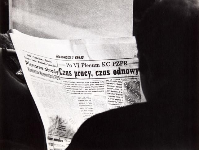 The series entitled “1981” documents the political intensification that occurred during what was known as the “Carnival of Solidarity,” the period between the legalization of the NSZZ Solidarność trade union and the interruption of the political liberalization process through the imposition of martial law on 13 December 1981. Here, Zygmunt Rytka depicts nameless people reading newspapers out in the streets. His camera focuses on the newspapers such that their content can be read in the resulting photographs. The artist alludes to this period of political upheaval by showing the citizens’ interest in political events. This series belongs to a larger group of works in which the artist analyses the language of the mass media. In this particular case, he also reveals his own political engagement. D.M.