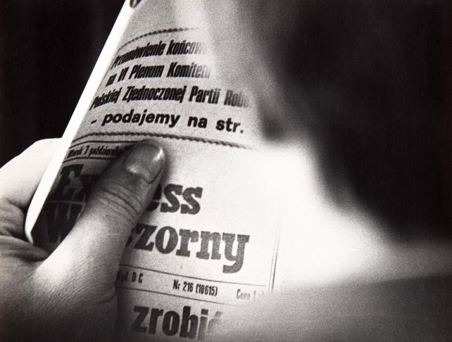 The series entitled “1981” documents the political intensification that occurred during what was known as the “Carnival of Solidarity,” the period between the legalization of the NSZZ Solidarność trade union and the interruption of the political liberalization process through the imposition of martial law on 13 December 1981. Here, Zygmunt Rytka depicts nameless people reading newspapers out in the streets. His camera focuses on the newspapers such that their content can be read in the resulting photographs. The artist alludes to this period of political upheaval by showing the citizens’ interest in political events. This series belongs to a larger group of works in which the artist analyses the language of the mass media. In this particular case, he also reveals his own political engagement. D.M.