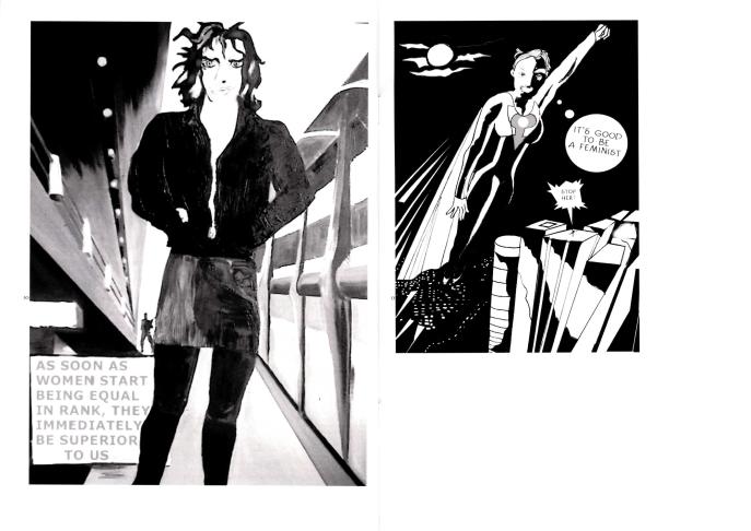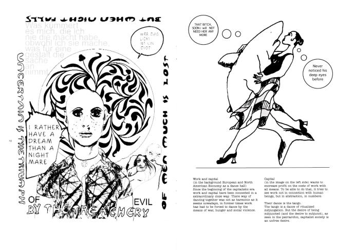 Linda Bilda’s title for her series “No Polit Comics” refers to the artist group NO of the 1950s and `60s, a group of Jewish immigrants working on political issues in New York. A further reference is the Japanese Nō theater. Bilda’s NO comics tackle social problems and propagate a more progressive form of society. Many topics discuss politics of the day as well as feminist issues. W.S.
