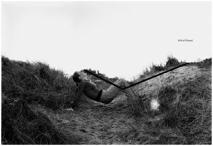 In “Body Configurations in Nature,” VALIE EXPORT inscribes her own body into the landscape, thus drawing a direct line between the functionality of the body and the architectural dimensions with which this body can adapt to given structures. With a clear geometric cut, EXPORT inserts her body into the Belgian dunes and uses black marker to emphasize the correlation between body and landscape parts. By giving the body a clear function that is inserted into the bare landscape, EXPORT heightens the spectator’s awareness of the subjective reality lying behind each bodily movement as a sign of cultural articulation. W.S.