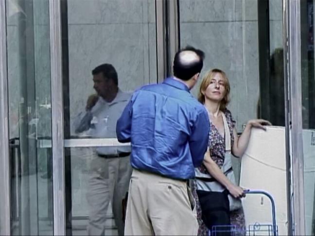 Carola Dertnig produced her video “Revolving Door” in the summer of 2001 when, as part of an artist in residence program, she had a studio on the 91st floor of Tower I of the World Trade Center in New York. In this work, as in the performances in her “True Stories” series (1997–2003), Dertnig employs the slapstick genre. The “True Stories” are based on the performativity of everyday actions and on authentic episodes that are experienced as embarrassing mishaps. In “Revolving Door”, Dertnig, laden down with materials, attempts to get through a revolving door of the World Trade Center with a trolley. Her real experience of getting stuck in the entrance in the hectic crush of passers-by became part of the project, as did her confrontation with the safety deficits of the WTC. In the summer of 2001, Dertnig already portrayed the WTC as a safety hazard; as part of the project she studied the bomb attack of 1993, the report on which revealed that the WTC did not have sufficient entrances and exits. U.M.P.