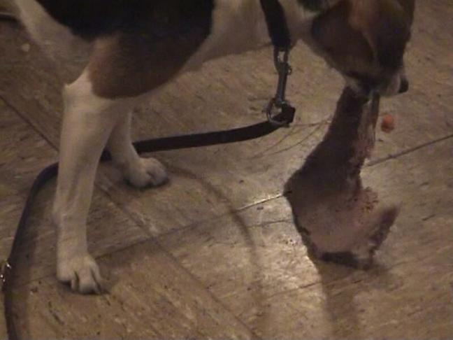 In "Tafelspitz," the artist—elegantly dressed and styled—visits her favorite downtown café and orders the eponymous traditional Viennese boiled beef dish. But the portion of meat she is served turns out to be so inelegantly oversized that she has great difficulty concealing the effort required to “polish it off.” As the diners seated nearby observe her with stolen glances, she slices up the piece of meat, which hangs far over the edges of her plate, and stuffs a good bit of it into her handbag while some fairly large pieces fall on the floor in the process and are gobbled up by another diner’s dog. S.E.