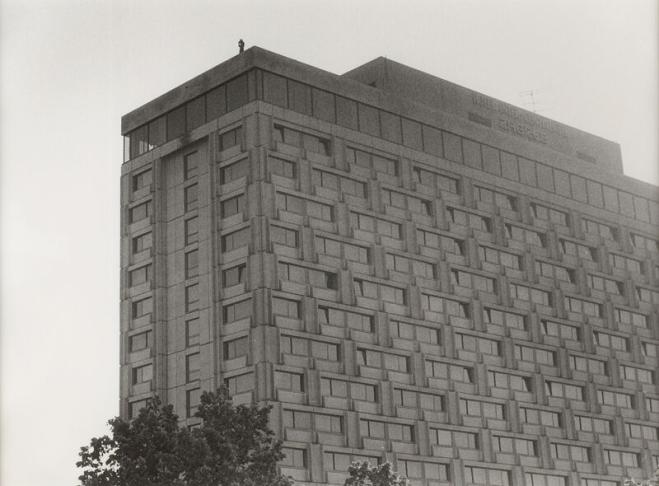 The performance “Triangle”, which Sanja Iveković documented in photographs, was developed during president Tito’s visit to Zagreb in 1979. Ignoring the official instructions which prohibited the presence of citizens behind windows and on terraces of buildings, the artist was sitting on her balcony and simulated the act of masturbation. Although she could not be seen from the street, she was aware of the fact that the surveillance teams on the roofs could observe her presence. Questioning the moment of the power demonstration in the public space and the simultaneous suppression of acts in the private sphere, provoking the police action, the artist exposed the restraints of individual decisions and collective regulations. Reading the book “Elites and Society” written by Tom Bottomore, drinking whisky and pretending to masturbate, Iveković challenged the redefinition of the boundaries between her own body and collective processes. A.B.
