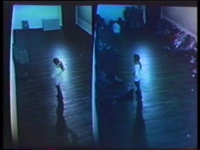 The performance comprises two parts. On the first day I perform in an empty gallery. My action in space corresponds to where I anticipate the audience will be in the space, and to how communication between us will develop. The action is videotaped. The next day a monitor is placed in one corner of the gallery, and a playback of the video begins at the same moment that the live action commences. Now, I attempt to transform my anticipation into reality, i.e. I repeat my private performance in the presence of the audience. The action is videotaped (with the camera remaining in the same position). S.I.
