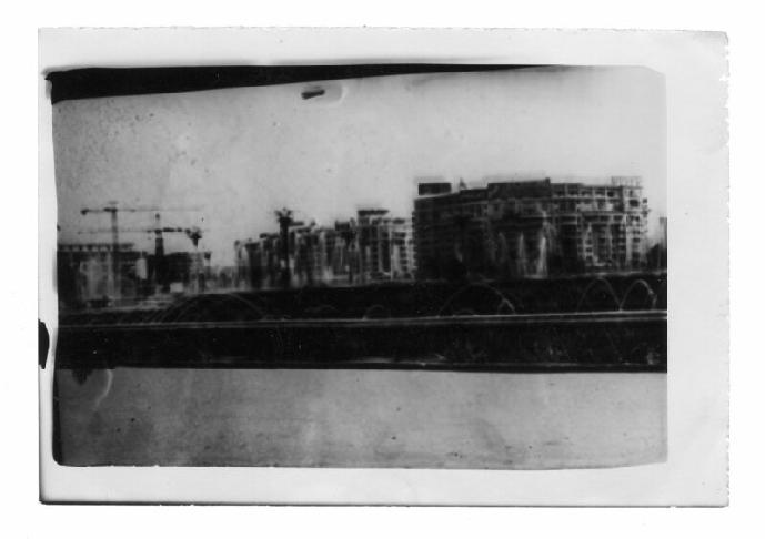 The work “Architecture Bucureşti” consists of 26 unique photographs made by street portrait photographer Nea’ Costica in accordance with the artist’s instructions. These pictures deal with urban wasteland as well as with the construction and deconstruction of both new and old buildings. Taken with an old-fashioned plate camera as a reference to the uniqueness of each photograph, which exists in both positive and negative prints, the individual images show Bucharest’s phase of urban transformation and the ambiguities of its changing urban outlook. The black-and white prints put the city in a somewhat spooky light as a place where corruption and dubious business activities are still very much present. Meeting standards set by the EU continues to be a difficult task for a place that was long viewed as Communism’s largest city and is gradually adapting to general European norms. And the reform of urban planning has become a task that still seems daunting with regard both to the city’s past and to its future. W.S.