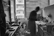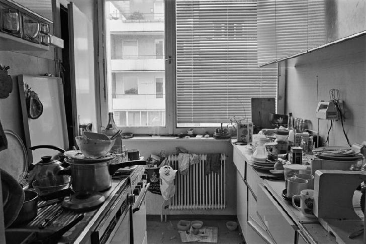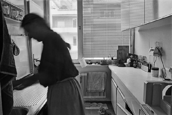 This series of 26 black and white slides named for the day and timespan during which it was taken shows a succession of movements and action performed in the context of conceptual art practices, enacted through and with the photographic medium. The camera assumes one single perspective, showing the artist’s kitchen with dishes waiting to be washed and put away. A conceptual approach of orderliness and exactitude evolves as the slideshow progresses, studying the action. Over the course of more than an hour, the artist is photographed in her endeavor to clean the kitchen and thereby put it in a state that annihilates any traces of the past. Through a mechanically set exposure time, the movements of the artist are captured while her fleeting gestures evade the camera’s otherwise sharp focus on her environment. Hence, this succession of slides accentuates the qualities of the mechanical apparatus and its analog features while adhering to a proto-filmic scenario. Although a very personal statement within Margherita Spiluttini’s oeuvre, this work still does refer to the artist’s focus on architectural and environmental details amidst which people reside and move about only for a certain period of time. There are also visible references to Margarete Schütte-Lihotzky’s “Frankfurt Kitchen” of the 1920s, in which a rational, unpretentious, and socially oriented mode of living supported progress towards a more egalitarian, gender-balanced world. W.S.
