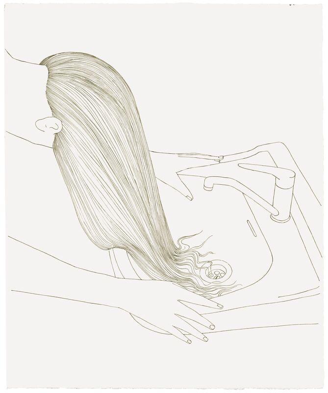 For Ulrike Lienbacher, drawing is a central medium. She puts her figures to paper with an exact stroke that emphasizes outlines and also permits a subtle type of plasticity. “My drawings,” she remarks, “are final works in their own right; they’re neither sketches nor preliminary studies. By no means do I draw in order to spontaneously capture impressions. My drawing is much rather the expression of a conceptual process, a process of construction. The ‘austere’ means of drawing demand reduction and precision. And working with lines forces one to be abstract and clear.” Lienbacher produces drawings of young women that show a variety of poses and gestures: attending to their intimate hygiene, dressing and caring for their appearances, washing, combing their hair, and while drying off their bodies or in underwear. The bodies of these girl-like figures, some of which are naked, are often realized in a fragmentary manner: such figures occasionally have no heads, or one can see only body parts such as the hands, hair or feet. Her figures’ gazes are never shown. And even if a figure does have a head, it is turned away from the observer, which consistently gives rise to an effect of self-absorbed, erotic interplay between presence and absence, which Lienbacher reinforces by accentuating special details of her black-and-white drawings with the sparing use of color. A dirt-brown shoe sole, yellow, red or grayish-black liquids, or panties with red flowers represent examples of meticulously developed “impure” motifs that stand out in formal contrast to the “pure” forms of the lines—which are reminiscent of classicist forms, albeit in a deliberately broken manner. S.E.