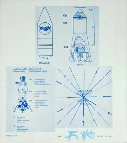 The „Asociácie / Association“ series represents another step toward the dematerialization of an artwork. Stano Filko‘s work teems increasingly with notions and visual signs of the earthly space, urban sites or the universe intersect in the framework of infinity. Filko's „Associations“ had charted a territory of cosmic visual explorations which numerous other local artists also dared to tread. D.G.