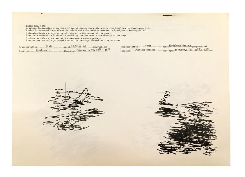 The term “transcendental conceptualism” may well derive from OHO’s use of esoteric practices, such as meditation and telepathy, in their conceptual works. In 1970, the OHO artists carried out certain telepathy-based projects. In February, David Nez and MIlenko Matanović went to New York, while Marko Pogačnik and Andraž Šalamun remained in Ljubljana. At this time, they realized two projects, both called “International Group Project America-Europe.” In the first, proposed by Pogačnik, the four artists drew a sign in a field at the same moment. In the second, proposed by Matanović, the four simultaneously looked into the sun, dropped a match onto a piece of paper, and marked its position. It would be wrong, however, to assume that the intention in these projects was actually to develop telepathic abilities (indeed, the results show no evidence of this having happened). Rather, we should understand these projects as systematic rituals used to draw the group more closely together, a sort of exercise in group identity. The actual results were not important; the important thing was to practice such rituals as to build up OHO’s collective identity.