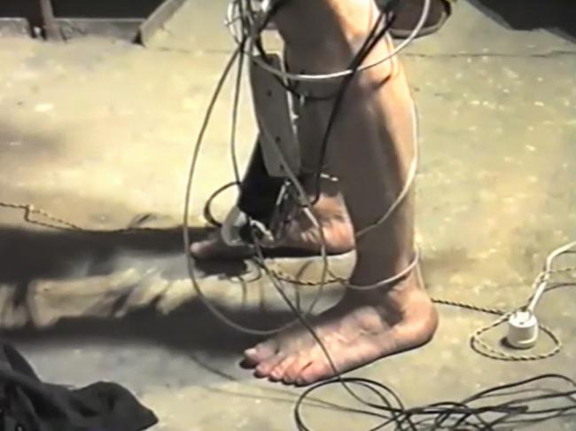 This video documents a performance amidst a small, intimate audience in which the artist undresses and then wraps various extension cords around his body, plugging them into power strips with sheets of paper placed between plug and socket. By also pulling the cable around his testicles and penis and by gagging himself, elements of auto-eroticism and SM practices are brought into play. The artist thus refers to the extreme body art practices of his predecessors and adheres to the context of 1990s Polish body art such as that of his colleagues Artur Żmijewski or Katarzyna Kozyra, who initially used their own bodies as vehicles for addressing individual concerns. W.S.