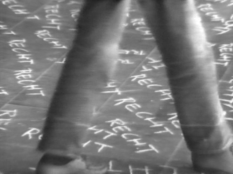 The letters written on the floor in chalk (which spell “Recht,” law) are walked on by the visitors. The design is gradually destroyed through usage, as the letters become smeared and are only partially legible—it is as if they are transformed from a text into an informal picture. But it is only through this process that the artwork is actually consummated. Through its participation, the audience performs the phrase, combining with the design on the floor (text then picture) to constitute the artwork. The performative character—contrasting with traditional definitions of art—and the political content of this work by Peter Weibel make it a typical expression of its time. G.H.