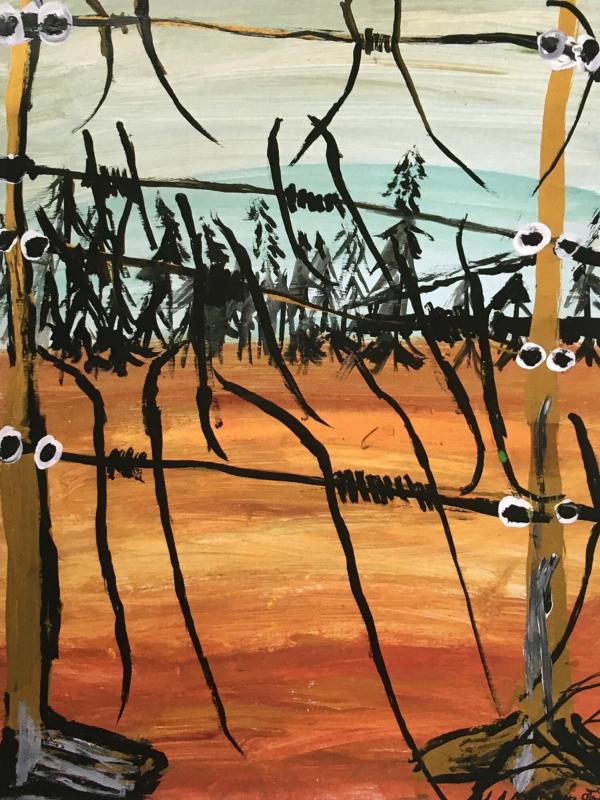 This acrylic painting on cardboard represents one of the many scenes from the concentration camps in which Ceija Stojka was imprisoned beginning at age ten. The vast open field with its uniform trees fenced off by barbed wire denotes the isolation and oppressive atmosphere as well as the emptiness of everyday camp life, a representation that is supported by somber, monotone colors. Stojka’s take on the hidden forces inside the camps—forces invisible from without—emphatically articulates themes of Roma art such as the ongoing quest for liberation from hegemonic power structures, inequality, and discrimination. W.S.