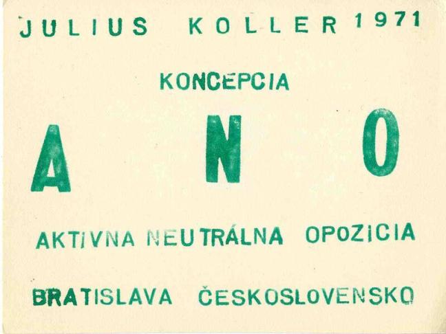 In 1965, Július Koller introduced his “Anti-happening” series and soon turned it into a permanent process of demystifying the institution of socialist culture. His dialectical language games, which he distributed as notices—text cards with stamped letters—were disseminated via the mail. In the 1970s, postal communication replaced the gallery space and effectively reached a wide spectrum of addressees worldwide. The use of anagrams and conceptual garblings makes room for the linguistic expression of notions from popular culture and the science-fiction sphere. The games, involving verbal mechanisms of denial and identification, make use of a tautological shift of positional demarcation and self-identification. Dialectical linguistic operations confront the field of subjective activities with the field of objective and real facts. Koller created these in the spirit of dialectical materialism to debunk the false consciousness and to demystify the social hypocrisy of socialist Czechoslovakia. D.G.