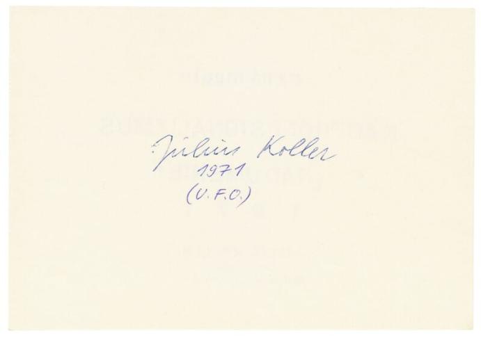 In 1965, Július Koller introduced his “Anti-happening” series and soon turned it into a permanent process of demystifying the institution of socialist culture. His dialectical language games, which he distributed as notices—text cards with stamped letters—were disseminated via the mail. In the 1970s, postal communication replaced the gallery space and effectively reached a wide spectrum of addressees worldwide. The use of anagrams and conceptual garblings makes room for the linguistic expression of notions from popular culture and the science-fiction sphere. The games, involving verbal mechanisms of denial and identification, make use of a tautological shift of positional demarcation and self-identification. Dialectical linguistic operations confront the field of subjective activities with the field of objective and real facts. Koller created these in the spirit of dialectical materialism to debunk the false consciousness and to demystify the social hypocrisy of socialist Czechoslovakia. D.G.