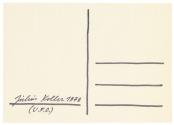 In 1965, Július Koller introduced his “Anti-happening” series and soon turned it into a permanent process of demystifying the institution of socialist culture. His dialectical language games, which he distributed as notices—text cards with stamped letters—were disseminated via the mail. In the 1970s, postal communication replaced the gallery space and effectively reached a wide spectrum of addressees worldwide. The use of anagrams and conceptual garblings makes room for the linguistic expression of notions from popular culture and the science-fiction sphere. The games, involving verbal mechanisms of denial and identification, make use of a tautological shift of positional demarcation and self-identification. Dialectical linguistic operations confront the field of subjective activities with the field of objective and real facts. Koller created these in the spirit of dialectical materialism to debunk the false consciousness and to demystify the social hypocrisy of socialist Czechoslovakia. D.G.
