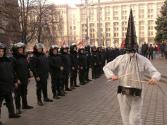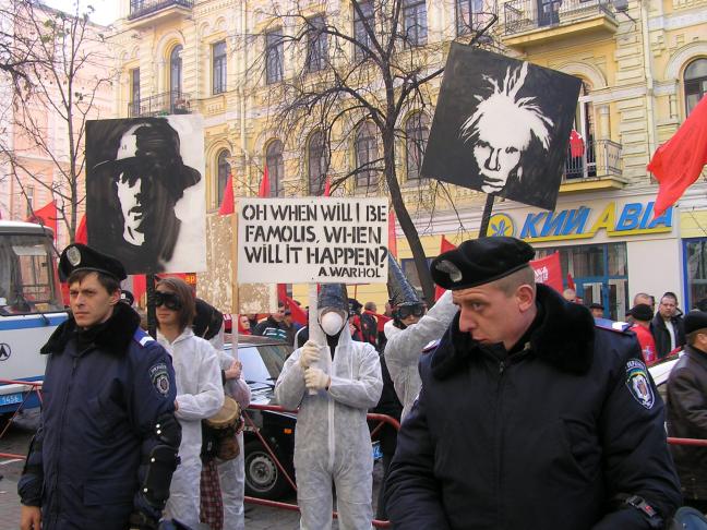 On 7 November 2005, R.E.P. appears on Maidan Nezalezhnosti, Kyiv’s Independence Square, to introduce itself as an independent political organization: with banners and quotations by Joseph Beuys and Andy Warhol, the group proclaims the slogan “Everyone is an artist.” The R.E.P. artists’ appearance here in white protective clothing with welder’s goggles, looking altogether somewhat akin to the Ku Klux Clan, promulgates this and other statements by these two heroes of the international art world as an aggressive gesture against the nationalist, communist, and clerical political forces in Kyiv. It is shortly before the arrival of the nationalists that the R.E.P.s first occupy the Maidan, beating drums and shouting slogans like “Andy Warhol is our president!” The reactions of the crowd are mixed—running from curiosity about the situation to scornful contempt. “We will R.E.P. you” hence also functions as a historical document from the years of transformation. H.S.