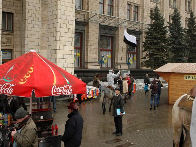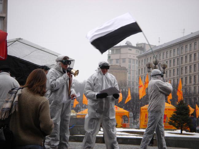 The artists of R.E.P. place their tent between tents of the various Ukrainian political parties and proceed to promote themselves. Their tent is white, as are their protective suits and the flags that they carry. Black and white are colors that were not part of the color spectrums used by the advertising agencies and technocrats of the political parties active during the Orange Revolution. R.E.P. conceives of its art as space for social communication. To create it, they quite deliberately employ the means of conventional politics and parody the other parties’ promises. Megaphones in hand, they deliver their manifestoes at a loud volume—which awakens curiosity and interest but indeed also rejection in passersby. Some of their slogans are paraphrases of existing ones, while others embody obscure demands or nonsense into which they nonetheless insert seriously meant agitation for themselves as artists: “We came to say that we exist, and the cultural establishment will have to deal with it.” This action took place on Independence Square in Kyiv in the midst of the parliamentary election campaigns. H.S.