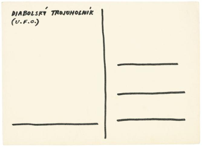In 1965, Július Koller introduced his “Anti-happening” series and soon turned it into a permanent process of demystifying the institution of socialist culture. His dialectical language games, which he distributed as notices—text cards with stamped letters—were disseminated via the mail. In the 1970s, postal communication replaced the gallery space and effectively reached a wide spectrum of addressees worldwide. The use of anagrams and conceptual garblings makes room for the linguistic expression of notions from popular culture and the science-fiction sphere. The games, involving verbal mechanisms of denial and identification, make use of a tautological shift of positional demarcation and self-identification. Dialectical linguistic operations confront the field of subjective activities with the field of objective and real facts. Koller created these in the spirit of dialectical materialism to debunk the false consciousness and to demystify the social hypocrisy of socialist Czechoslovakia. D.G.