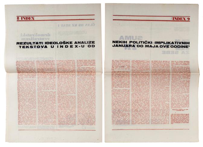 The copies of the issues of the journal Index from no. 201 to no. 208, which the members of KÔD co-edited and contributed to, communicate both artistic and political stances of the group. Their contributions were inserted into this journal’s standard mission of informing students about political and cultural events associated with the University of Novi Sad. The journal was obliged to publish official statements and reports about current issues of the University, but these were accompanied by critical and polemical texts or by reactions of the editors and other contributors. The journal also published a leaked internal document of the University Committee entitled, “Results of the ideological analysis of some politically implicated texts in Index”. Major theoretical texts on political, cultural and sexual issues were translated (Lukacs, Adorno, Bataille, etc.), as were reports on left-wing movements around the world. In the selection held by the Kontakt Collection, the copies of the Index issues are accompanied by a copy of the issue of the journal Új Symposion (no. 77, September 1971) that contains the text by Miroslav Mandić for which he was imprisoned, as well as by a copy of the banned issue of the journal Student (special issue, December, 1971) containing the text “Poem-Underground” by Slavko Bogdanović. B.D.