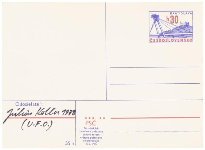 In 1965, Július Koller introduced his “Anti-happening” series and soon turned it into a permanent process of demystifying the institution of socialist culture. His dialectical language games, which he distributed as notices—text cards with stamped letters—were disseminated via the mail. In the 1970s, postal communication replaced the gallery space and effectively reached a wide spectrum of addressees worldwide. The use of anagrams and conceptual garblings makes room for the linguistic expression of notions from popular culture and the science-fiction sphere. The games, involving verbal mechanisms of denial and identification, make use of a tautological shift of positional demarcation and self-identification. Dialectical linguistic operations confront the field of subjective activities with the field of objective and real facts. Koller created these in the spirit of dialectical materialism to debunk the false consciousness and to demystify the social hypocrisy of socialist Czechoslovakia. D.G.