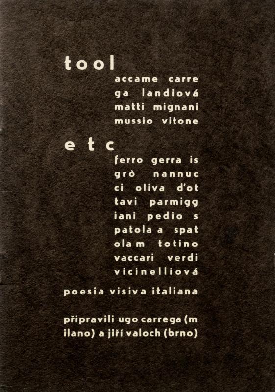 The aim of the exhibition “Tool etc.” was to present the works of Italian representatives of the Poesia Visiva movement. Alongside photographic documentation, typewriters, and drawings, this exhibition also included the books that Pedrottia and Sarenca published in their joint edition Amodulo. This exhibition’s catalog also contains a definition of the term “semantic complication,” which was brought to the field of visual poetry by Ugo Carrega and corresponds with Valoch’s term “non-verbal semantic texts,” meaning the intervention of color in a single word or a recurrent triad of words. J.P.