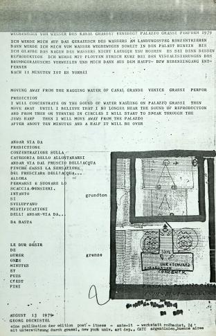 The artist’s concept for this performance in Venice contains texts written in four languages, some of them not identical in content, on a single sheet of A4-format paper. His performance directions read as follows: