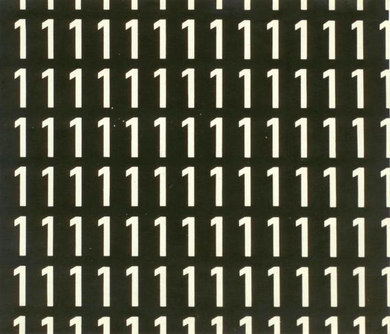 In this version of "Samotność," larger and thicker white “1” numerals appear on a black background. The numbers placed on the margins of the composition are cut off vertically and/or horizontally in a way that suggests the infinite or a fragment of a larger whole, as well as being suggestive of the process of or only partial access to the experience of solitude. Unlike in Dróżdż’s Samotność version on the white background (also from 1967), it breaks the static “monotony” of the “one-number” composition, cutting off the sequence of numbers in such a way that one might take it for a film frame, or an excerpt of the overall painting’s composition. As Dróżdż mentioned, Solitude was always made using one specific font and could not appear in any other font—a fact that was important for its visual effect. In the same way as the Samotność version on the white background, it is a good example of the existential and more abstract numerical tendencies in the artist’s oeuvre. This gave rise to larger projects (such as Numerical Texts / Teksty cyfrowe) during the 1970s, projects that involved more dynamic combinations of ten numbers “running to zero” (from 1 to 0). B.P.