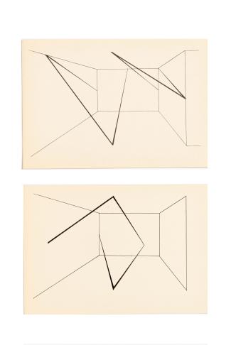 Dalibor Chatrný’s 25 self-published volumes from the 1969–73 period—created in reaction to the limited possibilities in terms of exhibiting and publishing in the wake of the Warsaw Pact invasion of Czechoslovakia in 1968—document the conceptualization and dematerialization of Chatrný’s work at that time. Each of these A5-format works, designed with a cover and containing loose sheets, was produced in small numbers by Chatrný’s brother Ivan on the offset printer of the School of Arts and Crafts in Brno. Each focused on resolving a particular riddle. “Projects 2,” consisting of six sheets, modifies the perspectival representation of space by means of drawn interventions in a model interior, giving rise to physically impossible variants. K.C.