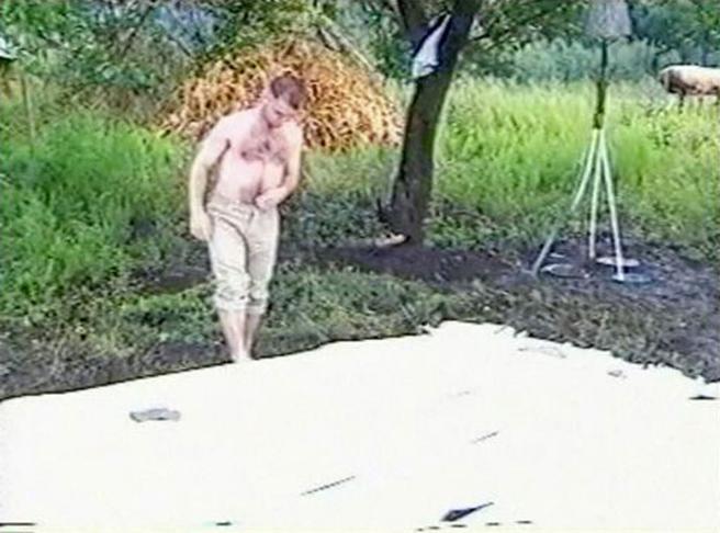White paper is a constant in Pavel Brăila's early performances, a screen between two worlds that have equal claims on the artist’s devotion. The first is the world of the immediate, the rough, honest context in which Brăila lives, the muddy soil and the familiar faces one calls home. The second is the artistic world—not yet the pragmatic, ruthless, global, English-speaking “art world,” but—at the time when “Work” was performed—a meeting place for a small, idealistic crowd of individuals who could afford to take risks, to look for new means of expression, to be, as the artist recalls, “at ease and spontaneous, situated outside the commercial circuit, confident that art could change something .” In “Work”, the artist brings these two worlds together, trying to make one part of the other. The camera watches both his determined gestures and the audience in the casual atmosphere, capturing the amused, puzzled or merely curious gazes. R.V.