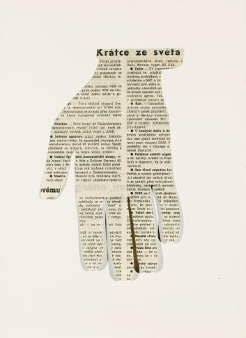 These two collages—each consisting of one contemporary newspaper clipping shaped in accordance with the outline of the author’s hand—are intimately linked with the 66 sheets of “A 1968 Weekly,” which documented the state of Czechoslovak society at the moment of the country’s occupation by the Warsaw Pact armies. This is clearly apparent from the news items and photographs contained in both collages as well from the inclusion of the shape of a hand in several more collages of the “Weekly” (now part of the collection of the Neues Museum Nürnberg). One collage bears the title “Briefly from the World” and sums up news concerning protests against the occupation held abroad, while the other shows the plinth of the St. Wenceslas monument at the center of Prague covered with protest posters bearing the names of prominent Prague Spring personalities. The inclusion of the hand-shape intensifies the documentary character of both works, works that Kolář termed “collage evidence.” K.C.