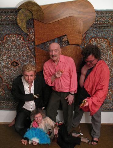 The photograph was first forgotten, until Konieczny used it for his own work, on a postcard he printed around 1993, adding a title “Associated Professor” (that is, professor in company, implicated in a situation). Uklański reappropriated it and added a second picture of the same protagonists eighteen years later, arranged in the same order (though now with a touch of disorder, and taken casually with an iPhone). Double-dated 1991–2009, Uklański’s work is a diptych—think of Blake’s “Songs of Innocence” and “Songs of Experience,” or paintings of the “stages of life”—picturing the states of human beings when the journey begins and when it comes to an end. The prodigal sons returned from their odysseys—or maybe just visiting. Here is Uklański half kneeling, his upturned gaze almost repentant, with one bare foot visible and a fake skeleton hand with one finger broken (recalling the fork’s broken tine in “Untitled (Wars I)” sticking out from the sleeve of his jacket, pressed to his chest. Bodzianowski, standing, in sandals and a button-down black shirt open to display his chest and belly, with a red rag draped over his left arm, looks down on a golden hand—a Chinese-made, decorative object from a contemporary bazaar—held in his own. Konieczny, in the centre, standing askew on slightly bended knees, holds a similar golden hand while awkwardly grabbing his pink shirt. Szwajewska, reclining on the floor in front of the men with a blue feather fan in her hand, wears a semi-transparent, embroidered flesh-coloured blouse with fake pink rose brooch, a black dress and silver block-heel shoes. All four are slightly dishevelled, aged, obviously not as confident as in the first photograph, on the edge of losing control of themselves—but never losing control of the image. The background is a relief made of interlocked pieces of veneered wood, stuck on an oriental patterned carpet; a work by Konieczny, Jean Arp made domestic, or “thought crazy.”
