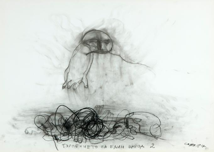 “The Endurance of a Nation” consists of seven drawings that depict gatherings of and acts by people who conjure up projections into the past and future. Created two years before the fall of Communism, this work epitomizes the avant-garde notion of the artist as one who anticipates social phenomena. Solakov’s distinct drawn figures, which, in this work, can be viewed as being prophets or demons, or party or family members, bring together several of those social and mythical levels so essential to storytelling with content derived from real life. This series is chronologically ordered and begins with anger, thereafter continuing with contemplation, thought processes and hopes for the future. The work’s overall title also references Bulgaria’s longevity within history—Bulgaria being the country where the Cyrillic alphabet was originated in the 10th century, but also a place that was ruled by the Ottoman Empire for almost five centuries. The constant changes within history are alluded to in drawing No. 5, in which one of Solakov’s characteristic creatures is seen cutting some undefined material while a text over its head reads “to reshape/recut history.” The fact that the final drawing bears the word “hope” attests to the notion that the expectation of improvement has always been at the core of the people’s thinking with regard to sustainable efforts. W.S.