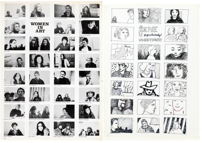 For her work “Women in Art – Women in Yugoslavian Art,” Sanja Iveković took a page from an issue of Flash Art entitled “Women in Art.” This page shows photographs of internationally renowned women artists. Underneath each photo is a caption citing the depicted woman’s name. On the opposite page, Iveković drew women and grouped them in the same manner as the portraits shown on the Flash Art page—albeit without their names. Her page is entitled “Women in Yugoslavian Art.” The fact that there are no names underneath these portraits effectively anonymizes these women and hints at problematic aspects of 1970s Yugoslavia, whose artists—especially female artists—remained largely or entirely unknown to the international public. W.S.